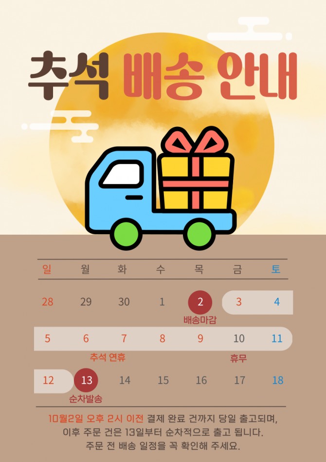 제목 | 추석 연휴 기간에 따른 택배 일정 공지 | 등록일 | 2025/10/01 11:36 |